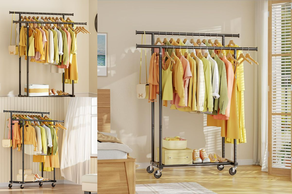 HYSEYY Double Rods Clothes Rack maximizes storage with 210-lb capacity, dual hanging rods, and mobility—perfect for small spaces and wardrobes.