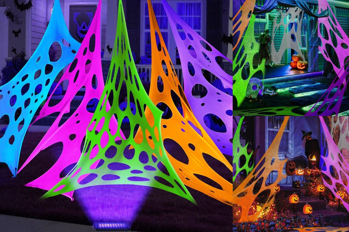 Transform your yard with the Glow in the Dark 1300 Sqft Giant Spider Web Halloween Decorations. Vibrant colors, UV blacklight, spooky atmosphere for $19.96!