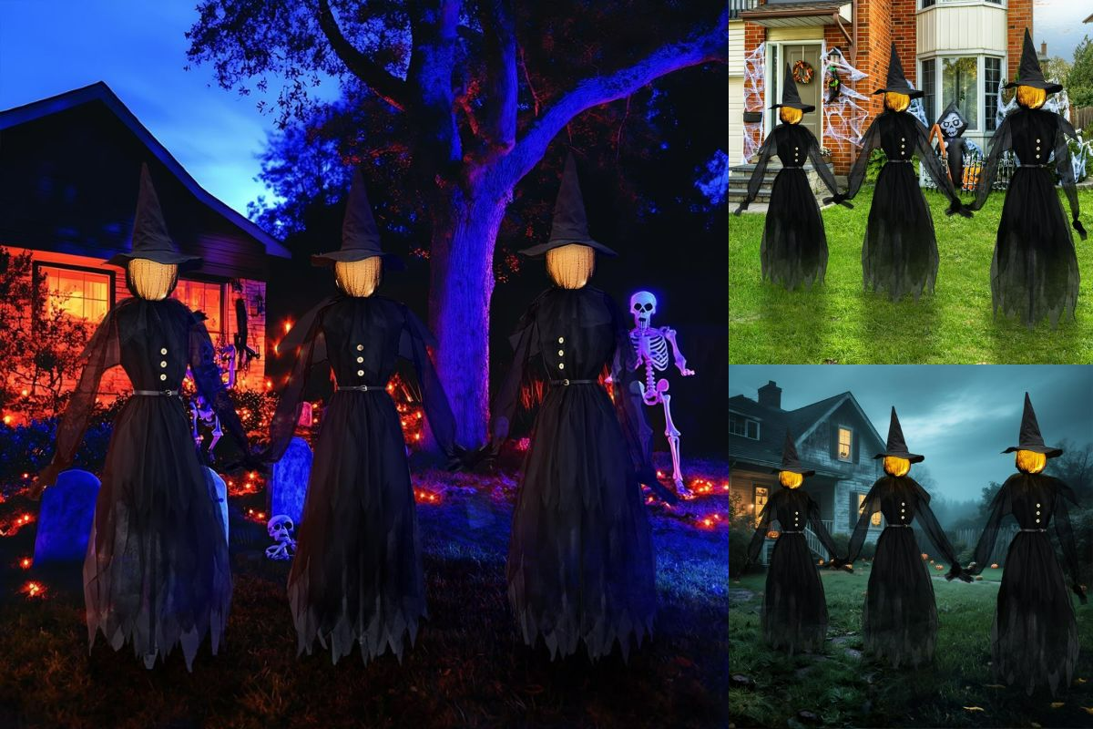 Elevate your yard with the Halloween Decorations Outdoor 4.9 FT Set of 3 Witches Holding Hands featuring glowing LED heads for a spooky ambiance.